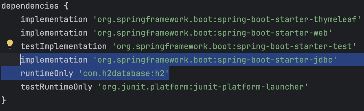 build.gradle 파일에 jdbc, h2 데이터베이스 관련 라이브러리 추가