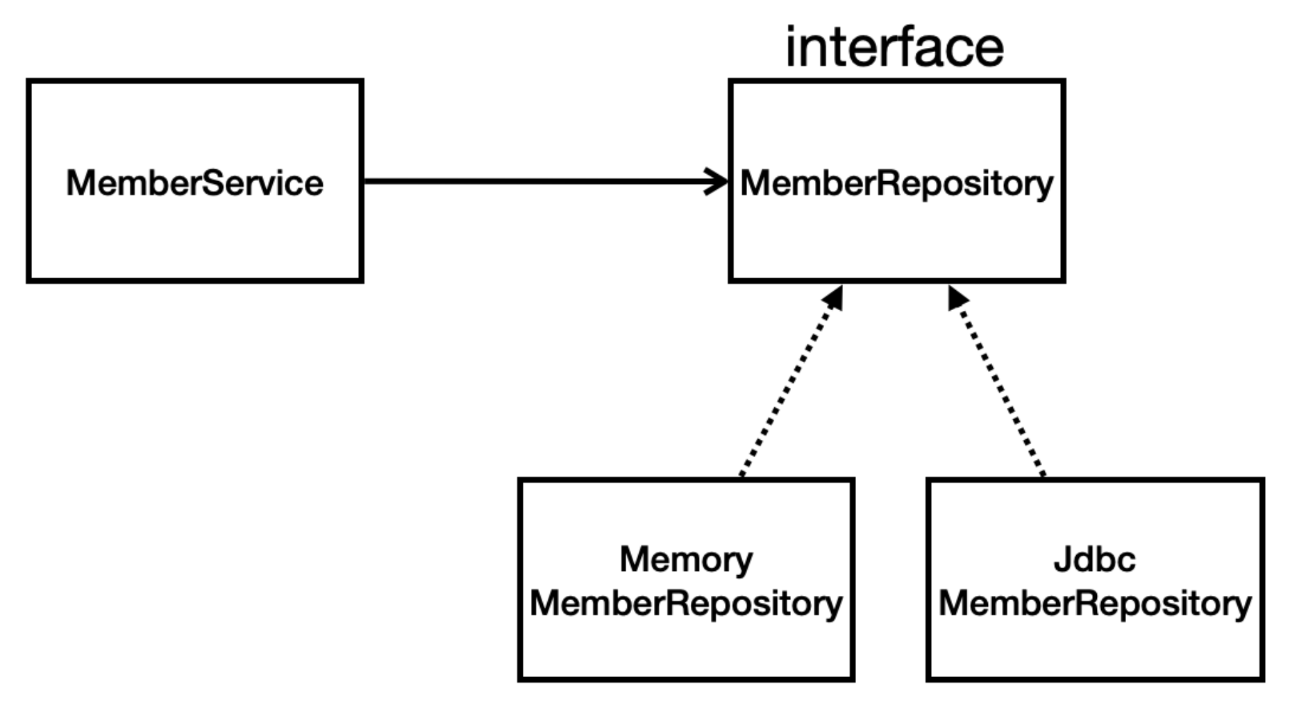 - MemberRepository는 MemoryMemberRepository와 JdbcMemberRepository를 구현체로 가지고 있음