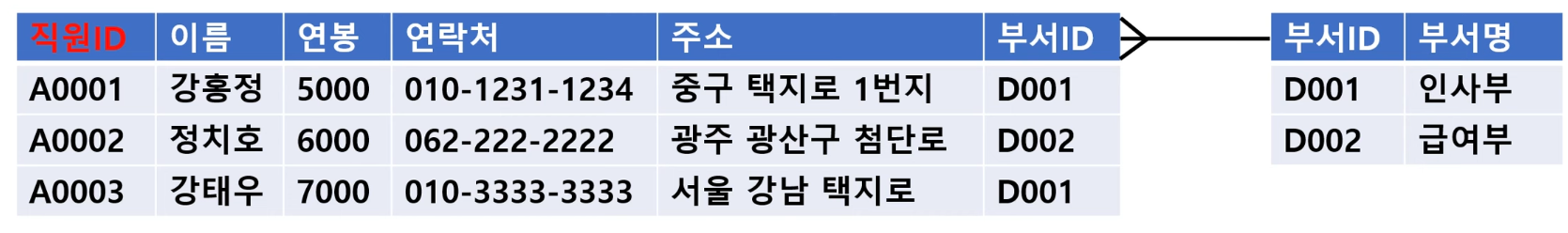 결정자(직원ID) → 종속자(나머지 칼럼들) : 완전함수종속(2NF 만족)