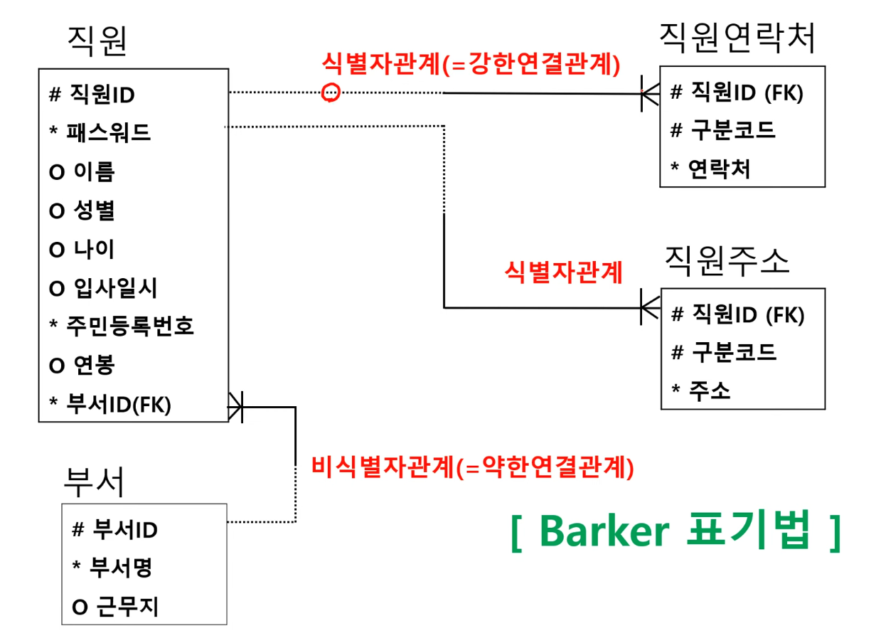 - 식별자관계: 외래키(빌려온 키)가 PK(식별자)의 일부분인가?