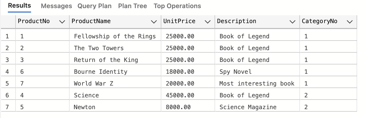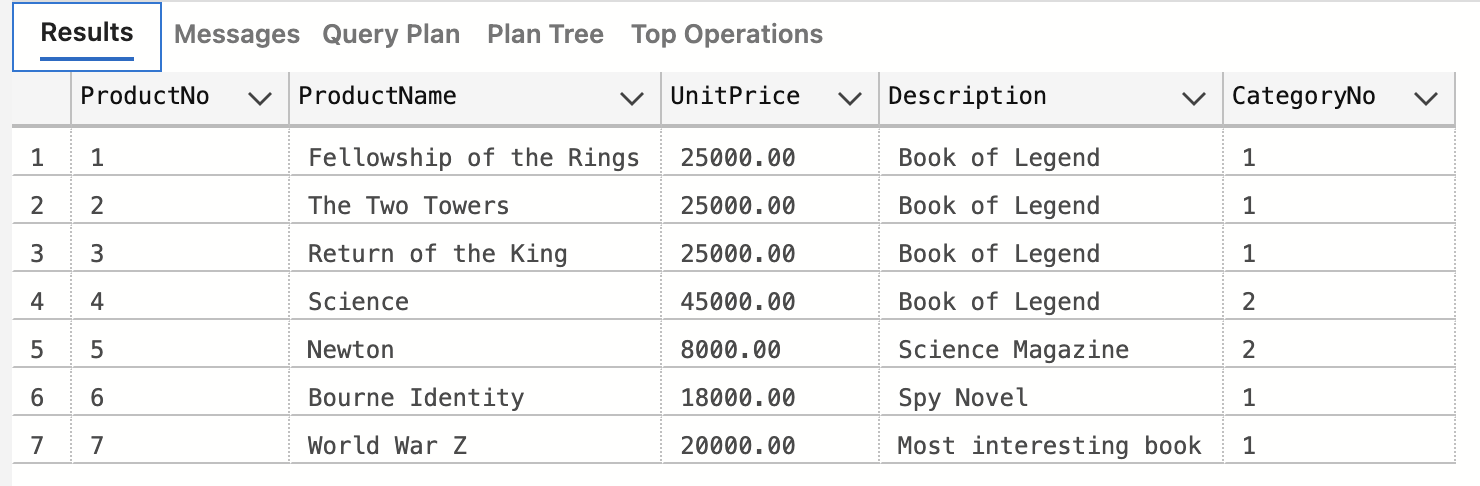 INSERT INTO Product VALUES (1, 'Fellowship of the Rings', 25000, 'Book of Legend', 1)
