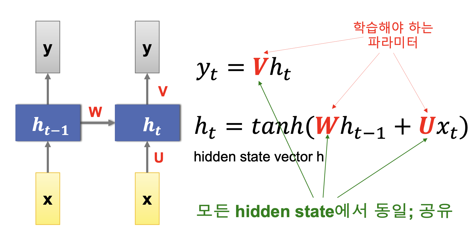 학습해야 하는 파라미터 V, W, U는 모든 hidden state에서 동일합니다. 즉, 파라미터를 공유하여 사용합니다.