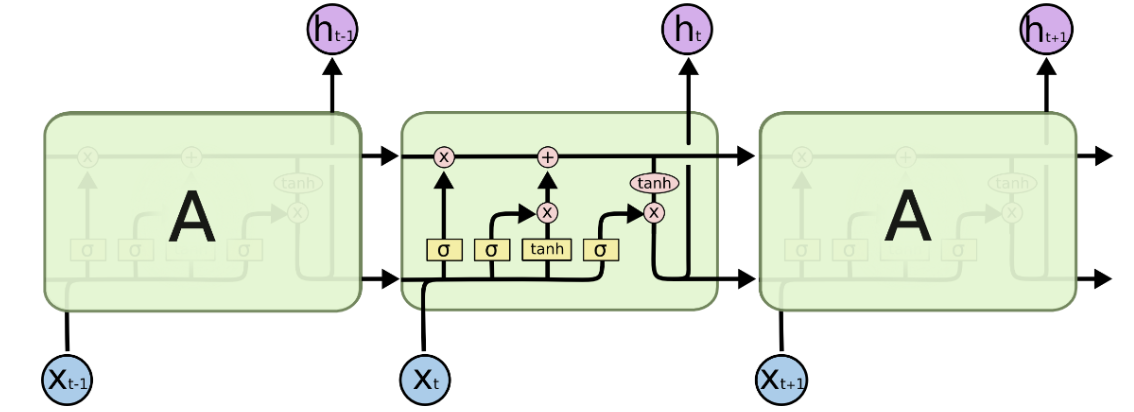 이때, 파란색 박스인 ht-1과 ht는 hidden state 입니다.