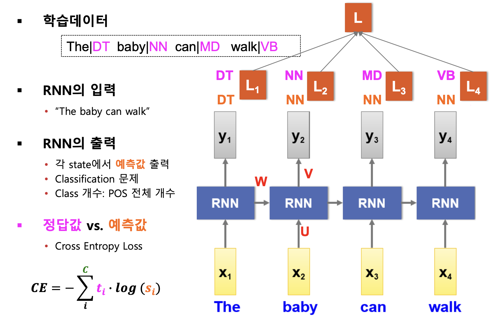 - 입력 및 출력: 품사 태깅 예시처럼 "The baby can walk"과 같은 문장이 RNN의 입력으로 들어가고, 각 단어에 대한 예측 품사가 각 스텝의 출력으로 나옵니다.