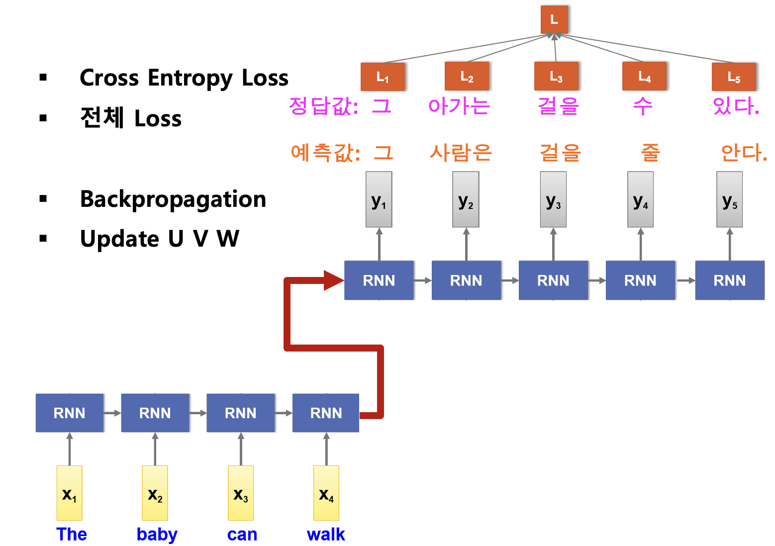 학습은 병렬 데이터(예: 원문과 번역문 쌍)를 사용하여 Encoder와 Decoder의 파라미터(U, V, W)를 초기화하고, 예측값과 정답값 간의 Cross Entropy Loss를 최소화하는 방식으로 진행합니다.